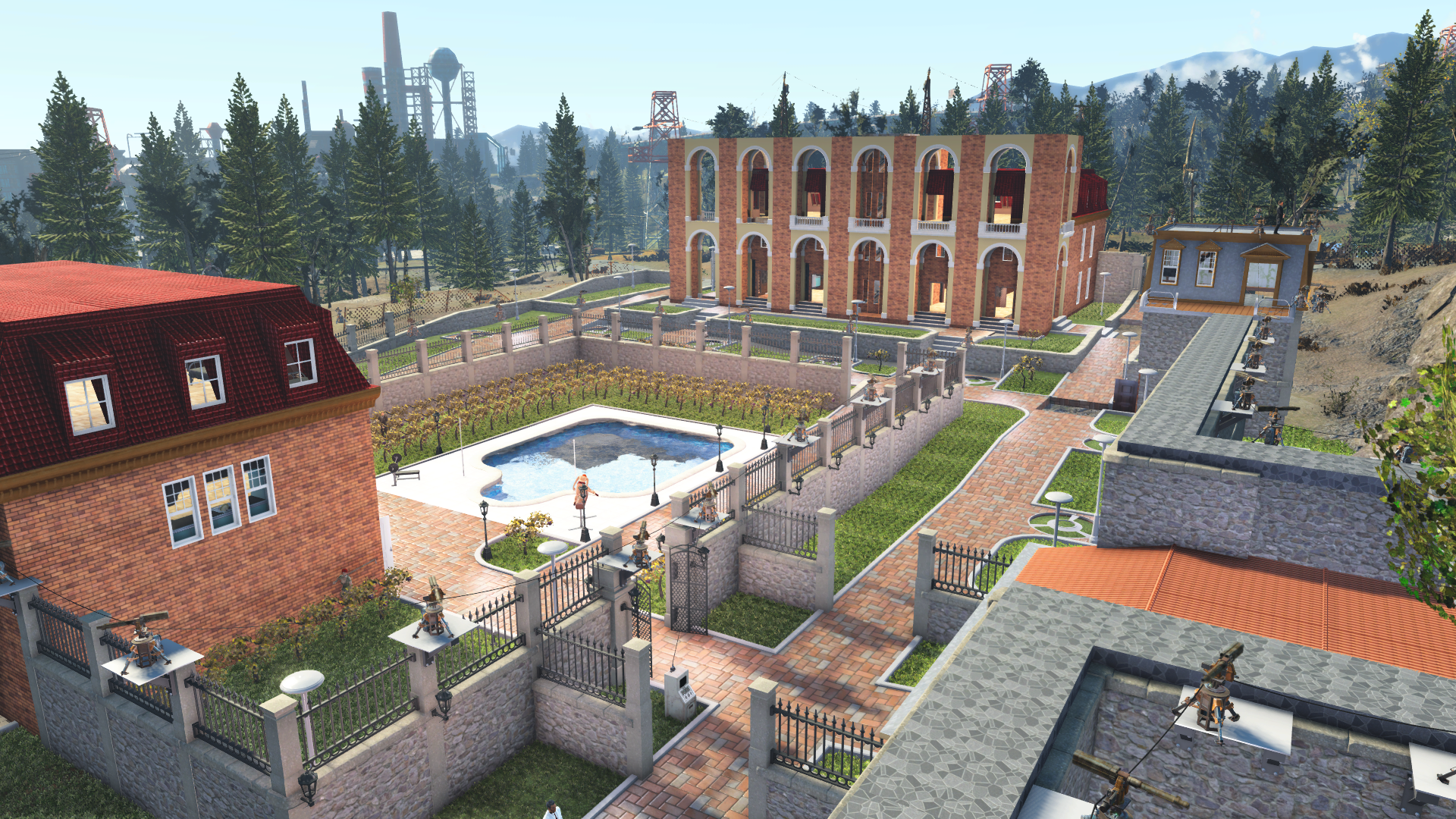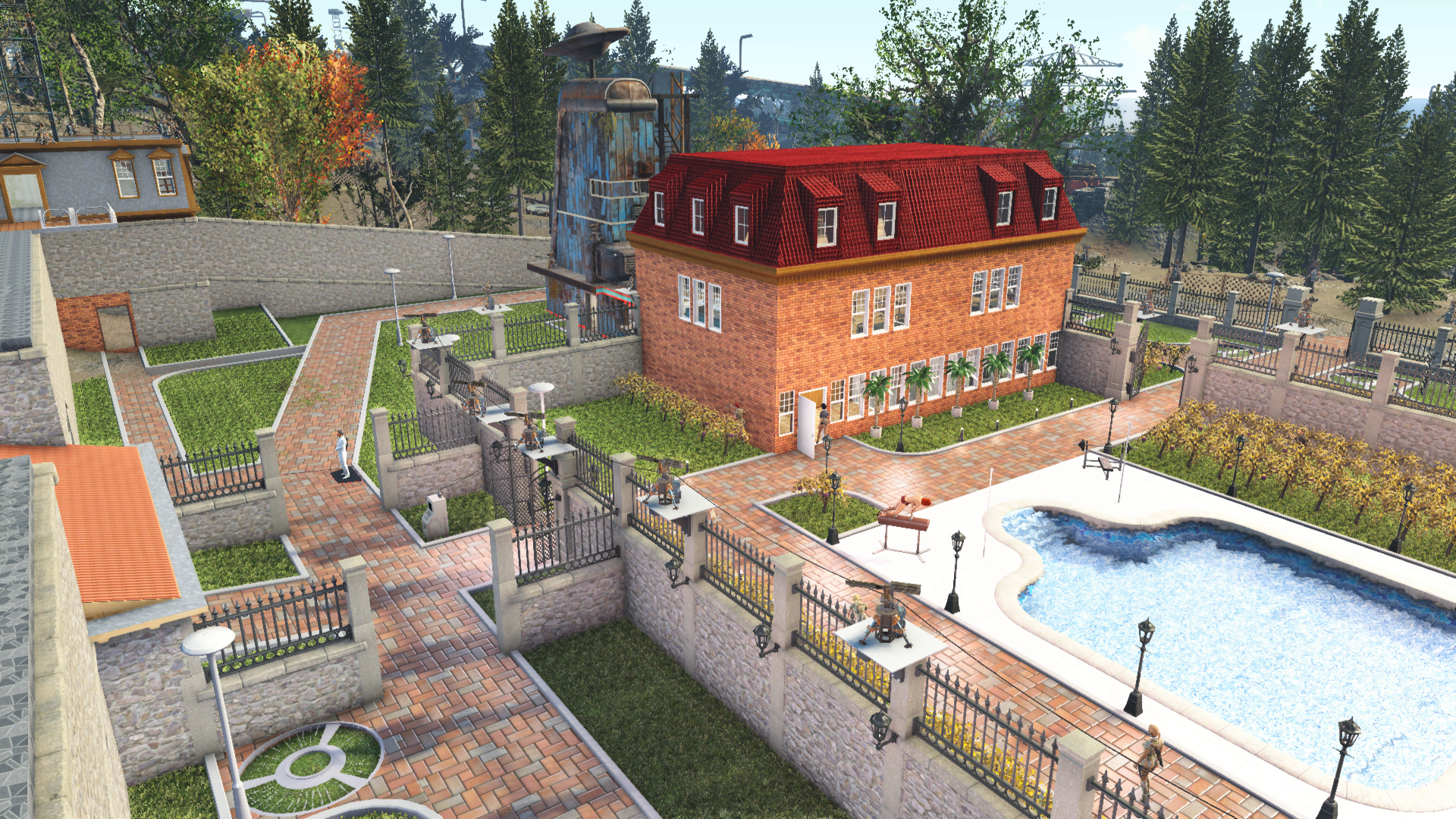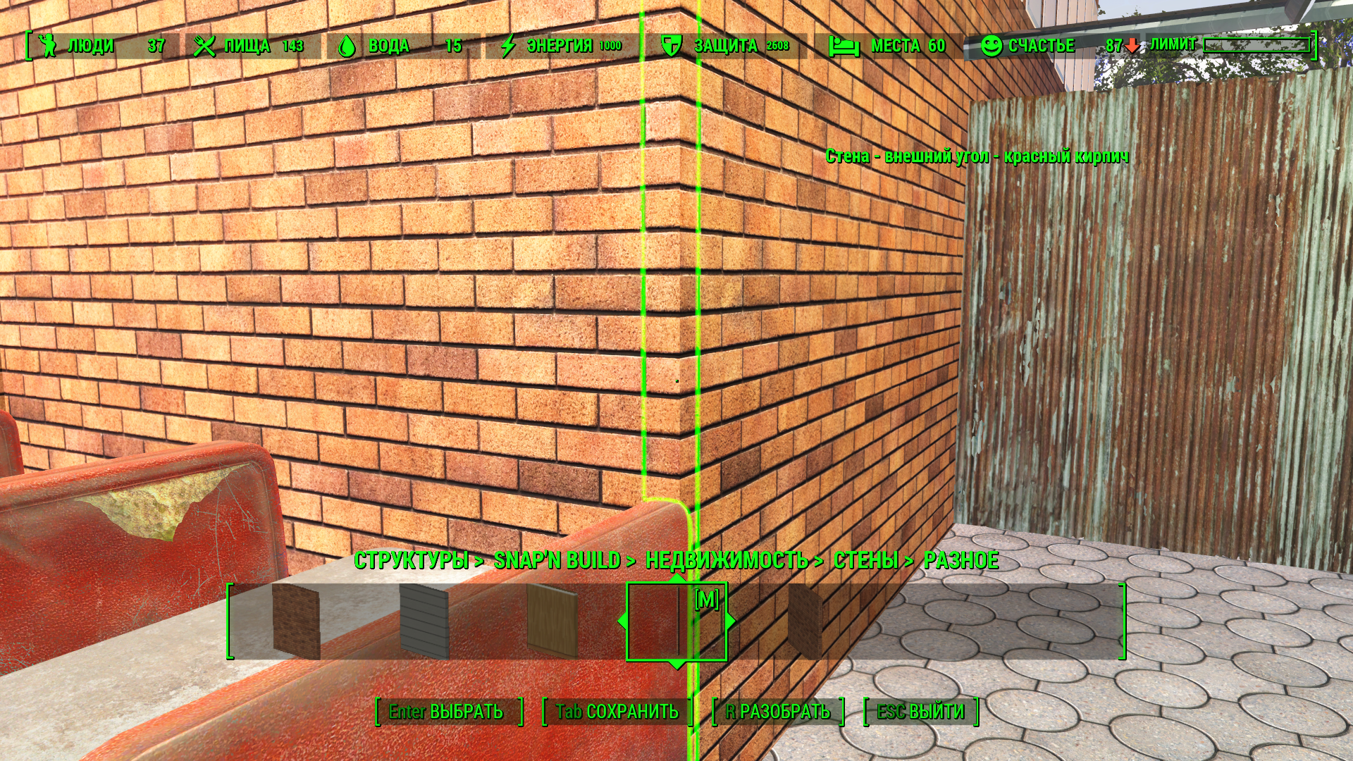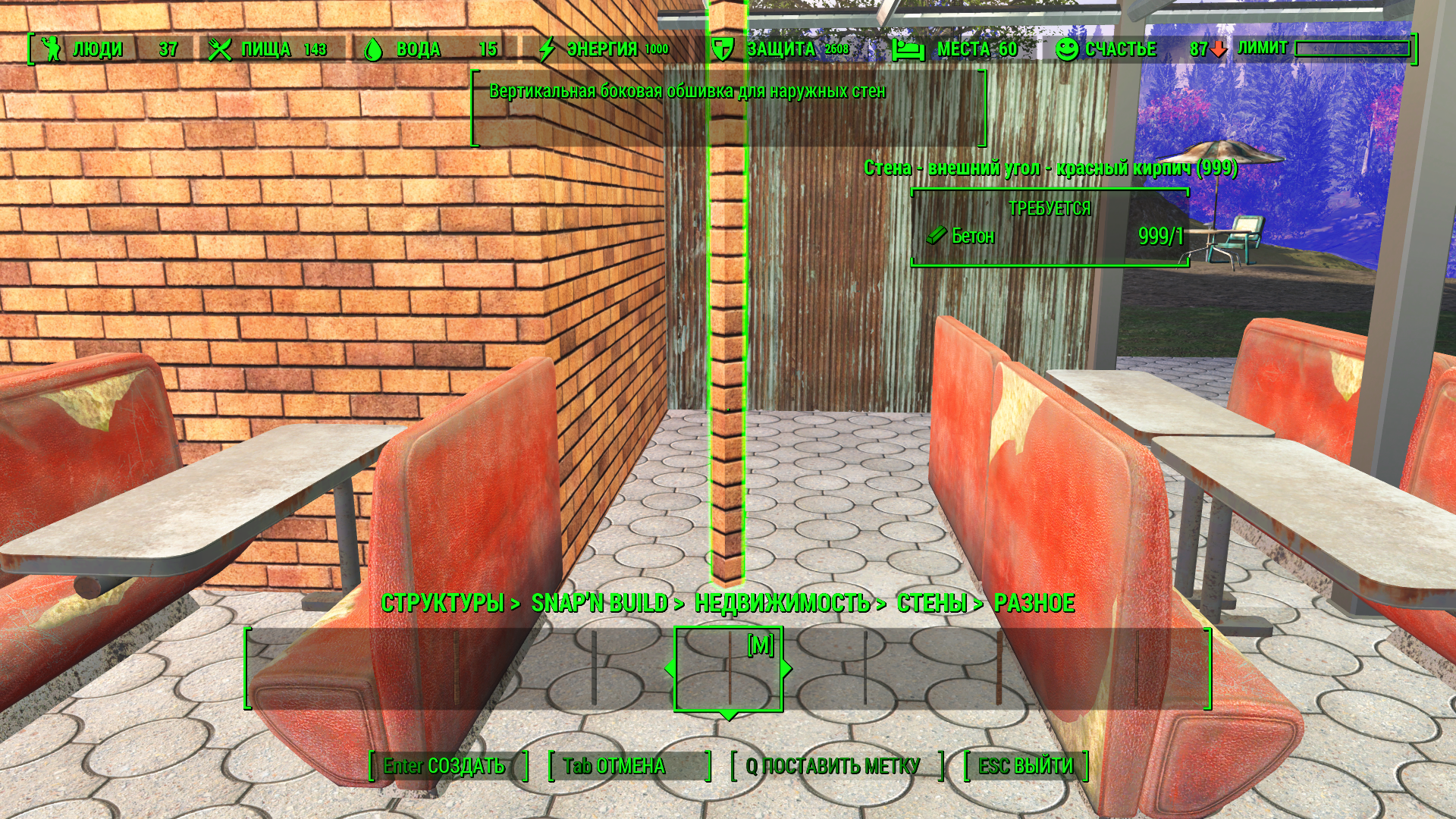 Не понимаю что имееш ввиду под "угловье елементь".  Если про пол, то там земля, а по краю тротоар. Етот тротоар по краю что то не тот, перво туда все елементь пропадает- нет привязка к полу и поселенць и спутники не ходят вне его конца (видно туда нету невмеши). Решил не рисковать и туда не строить. Лучше туда максимум травка с кусть и другие украшательства.