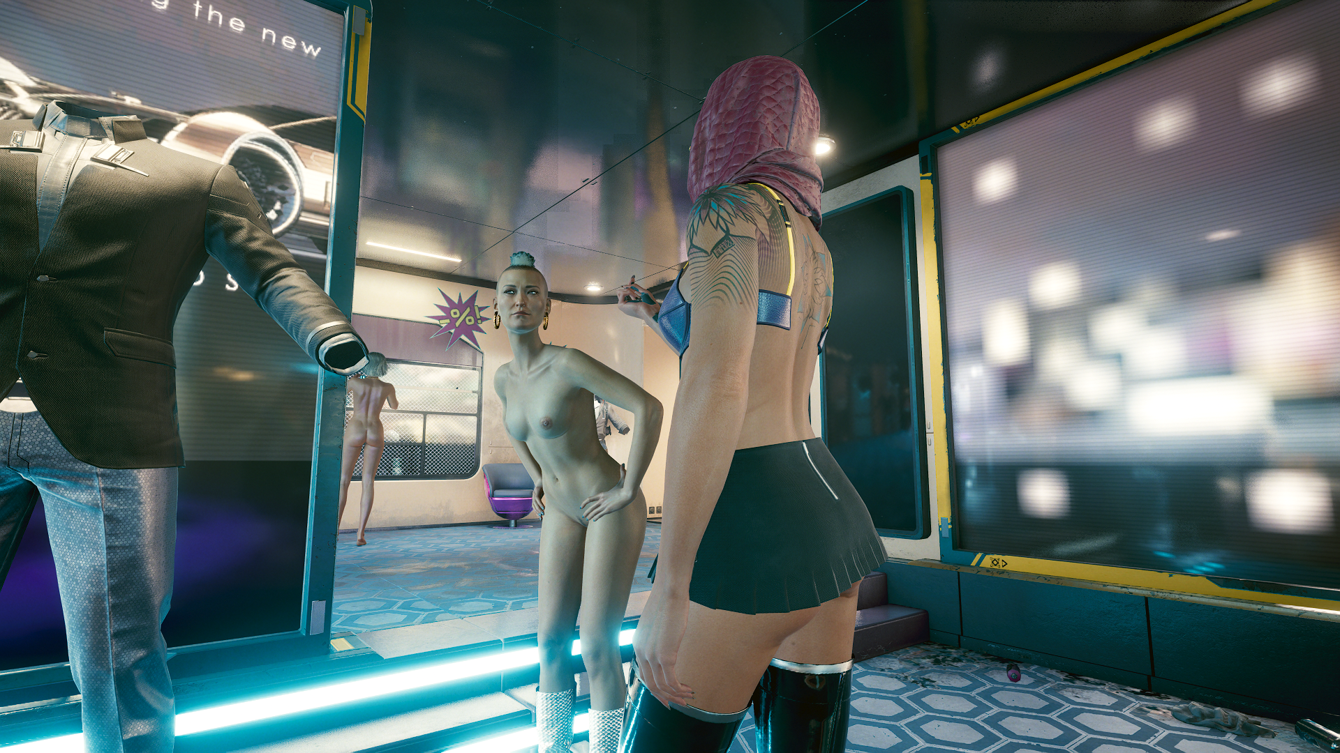 В супер мини-юбке.