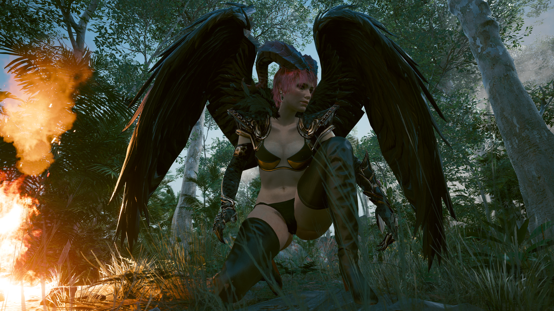 Ви-Суккуба ночью у костра в своём лесу.
