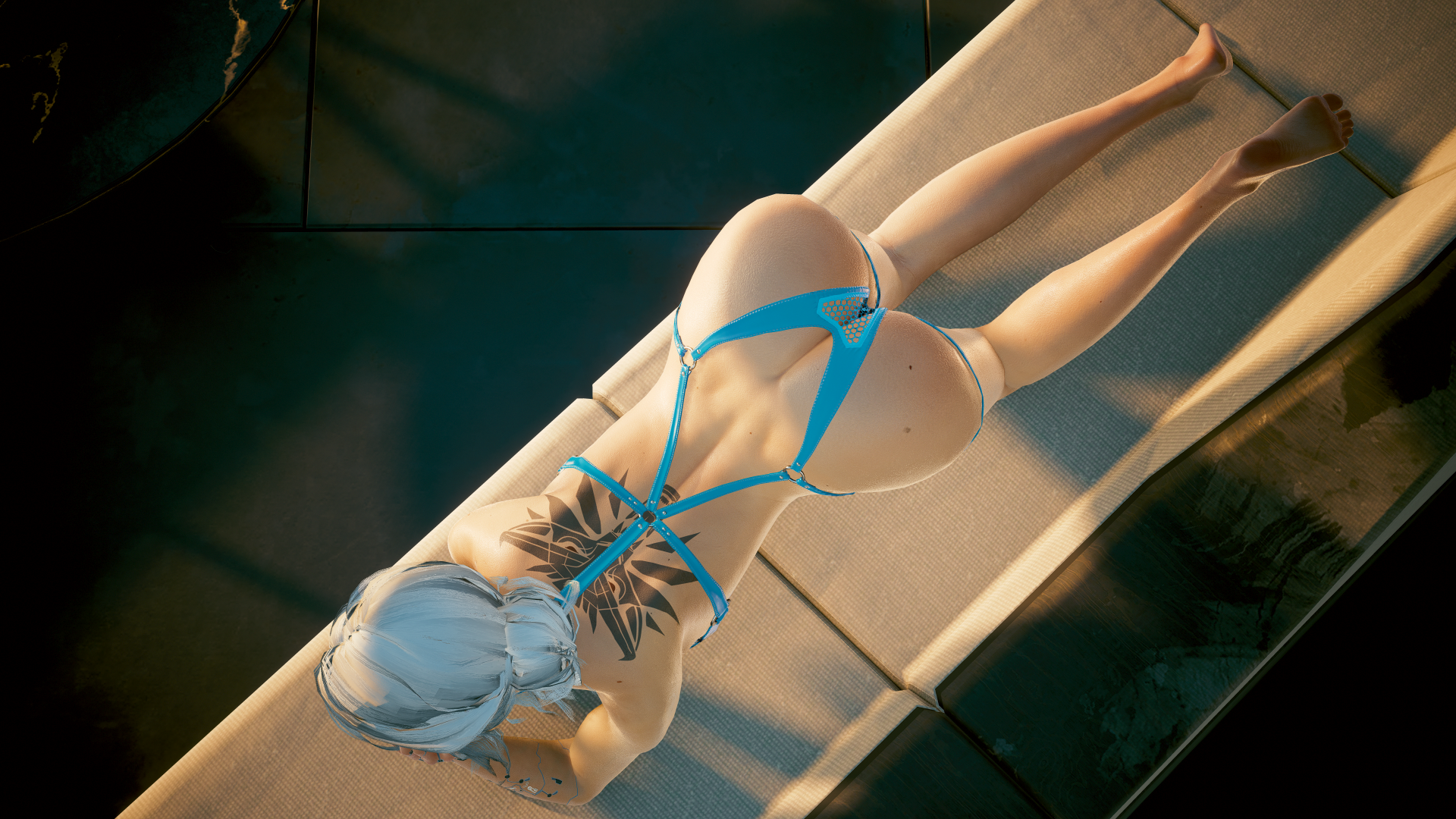 Вид сверху. Ранним утром у бассейна.